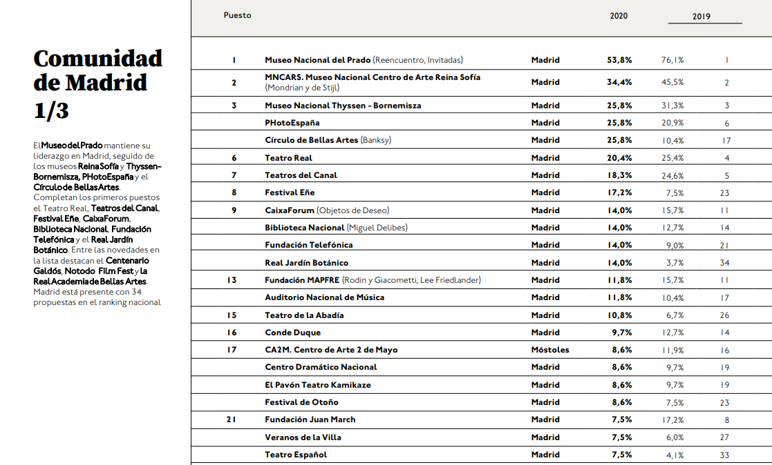 En el ranking de la Comunidad de Madrid, el Círculo de Bellas Artes aparece en tercer lugar, mejorando en catorce posiciones respecto a 2019. Comparte escalafón con PHotoEspaña y con el Museo Nacional Thyssen-Bornemisza. Y es que la exposición de BANKSY The Street Is A Canvas ha tenido una gran acogida, no solo entre el público, sino entre los profesionales de la cultura madrileña que han participado. La clasificación la lidera el Museo Nacional del Prado (gracias a sus exposiciones «Reencuentro» e «Invitadas») y le sigue segundo el MNCARS. Museo Nacional Centro de Arte Reina Sofía.