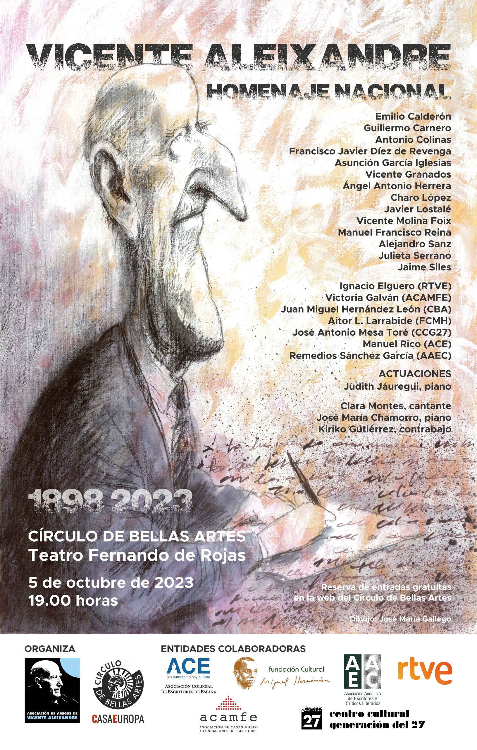 La Asociación de Amigos de Vicente Aleixandre, en estrecha colaboración con el Círculo de Bellas Artes, y otras prestigiosas entidades culturales y fundaciones, organizará el próximo 5 de octubre un merecido homenaje nacional al poeta y premio Nobel, coincidiendo con el año en el que se conmemora el 125 aniversario de su nacimiento.
