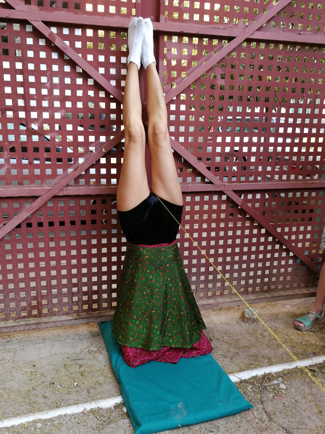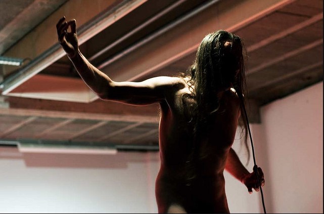 Sofía Misma es una artista de acción que hace uso del propio cuerpo como soporte, medio y mensaje. La máquina de coser como instrumento sonoro produce un movimiento regular y construye una prenda-utensilio para realizar una obra plástica en acción.