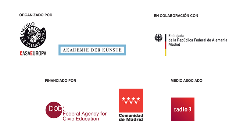 Organizado por CBA y Akademie der Künste · En colaboración con Embajada de la República Federal de Alemania · Financiado por Federal Agency for Civic Education y Comunidad de Madrid · Medio Asociado Radio 3