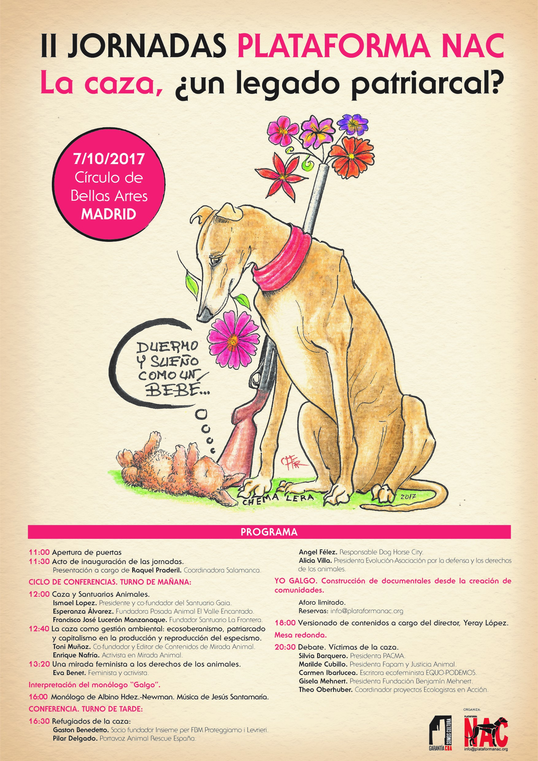 La plataforma NAC, organizadora de estas jornadas, es una asociación sin ánimo de lucro cuyo objetivo es concienciar y promover el respeto por los animales, con particular incidencia en las especies afectadas por la práctica de la caza.