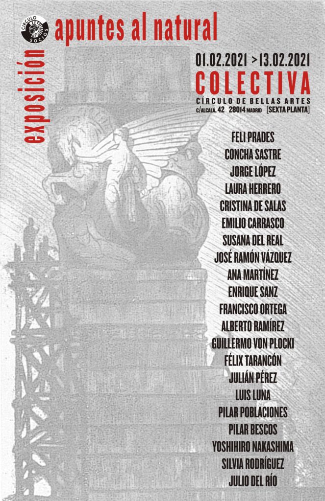 Apuntes al natural es una exposición colectiva de los socios del Círculo con obras de: Feli Prades, Concha Sastre, Jorge López, Laura Herrero, Cristina de Salas, Emilio Carrasco, Susana del Real, José Ramón Vázquez, Ana Martínez, Enrique Sanz, Francisco Ortega, Alberto Ramírez, Guillermo von Plocki, Félix Tarancón, Julián Pérez, Luis Luna, Pilar Poblaciones, Pilar Bescos, Yoshihiro Nakashima, Silvia Rodríguez y Julio del Río.