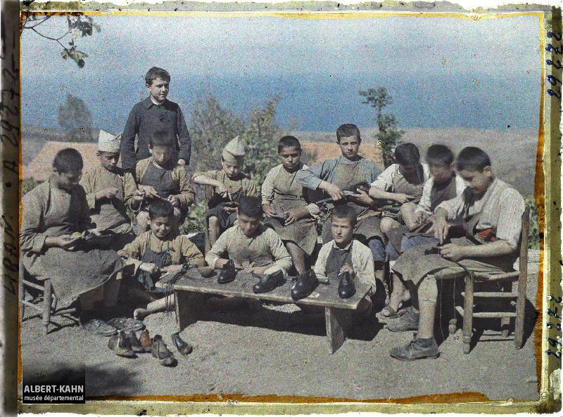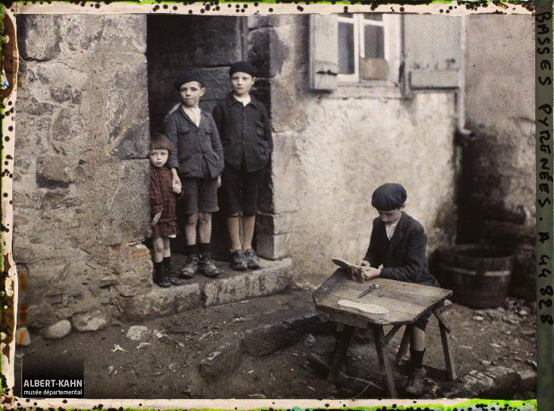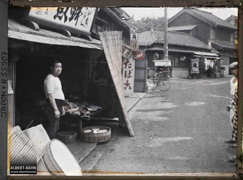 Route de Rattwik à Mora Route de Mora à Leksand Bosnie, Sarajevo, Une boulangerie Bosnie, Sarajevo, Une boulangerie Serbie, Krouchewatz Environs, Sur la route de Krouchewatz, femmes égrenant le maïs (dernières maisons) Serbie, Bitolj, Le vendeur de limonade Albanie, Tirana, tziganes Egypte, Louksor, Bords du Nil à Louksor Egypte, Assouan, Savonneuse au bord du Nil Egypte, Edfou, Femmes venant de puiser de l'eau dans le Nil Egypte, Minieh, Boutique de cuisinier (Fellah) Egypte, Minieh, Boutiques Mongolie, La poste mongole Italie, Venise Chine, Mongolie - La route d'Ourga Suisse, De Pontresina à Roseg, De Pontresina à Roseg France, Près le viaduc des Fades Route d'Elfkarleo à Gelfe France, Moreuil, Hôpital de Moreuil France, Nimes, Les 2 en rouge Nîmoises aux yeux bleus et l'autre brune aux yeux noirs France, Saint Flour France, Pardines, Quelques habitants Espagne, D'Astorga à Léon, Trois ânes montés France, Reims, Groupe place Drouet d'Erlon France, Reims, Au marché France, Reims, Place Nicolas Bergier déménagement France, Reims, Boucherie chevaline rue Gambetta après bombardement France, Reims, Mendigot France, Reims, Mr et Mme Gauthier et personnel France, Reims, Boulangerie St Rémi France, Soissons, Magasins généraux. Ouvriers militaires France, Soissons, M. Perdon, Confiseur France, Paris, Marchande de fleurs Boulevard de la Madeleine Palestine, Jaffa, Jaffa femme publiques Arabes Egypte, Port-Saïd, Les Chinois au camp : La soupe France, Roscoff, Le départ pour la pêche, Mr Masson fils avec s/équipe de marins pêcheurs France, Maurepas, Recherche d'Obus boches dans le bois Douage France, Esnandes, Un groupe de bouchoteurs France, St Emilion, Vendangeurs au Château Pavie, Grand 1er Crû France , Vallée D'Ossau, Les musiciens le jour de la fête France, La Rochelle, Pêcheurs au Carrelet France, Esnandes, près La Rochelle, Groupe de bouchoteurs St Emilion, Groupe de Vendangeurs Syrie, Aley, Ecole industrielle Française, Enfants apprenant la cordonnerie Syrie, Damas, Marché au blé, à droite, un type Druse du Hauran, un Bédouin et une Bédouine Syrie, Tell-Es-Shehab, Deux types du Hauran France, Bagnères de Luchon, Trois petits Espagnols Vallée de Cambasque, groupe de Paysans Prusse, Gelsenkirchen, Défournement de Coke ; extraction France, Bayonne, Sur la Route de Bayonne à St Etienne, attelage de boeufs Suisse, Genève, Arrivée de Mr Mac donald France , Tardets, Au fronton - Les 2 Equipes de Pelotaris France, Mauléon, Petit Sandalier France, Mauléon, Une famille de Sandaliers Maroc, Marrakech, Le tisserand Irak, Bagdad, Louffas _ avec hommes Japon, Tokyo, Marchand de poisson Alsace, Saverne, Famille Fischer Hollande, Volendam, L'Ecole Protestante (260 protestants et 2500 Catholiques peuplent le village) Hollande, Marken, Le Peintre Hering dans son atelier Hollande, Volendam, Ecole Catholique de garçons Dahomey, Joueurs de tam-tam (Yorouba) Epiciers à l'entrée de leur boutique, devant laquelle sont exposés des fûts de bière, de «miso»  (pâte de haricots de soja fermentée), de saké et du charbon de bois, Tôkyô, Japon, 1926-1927, (Autochrome, 9 x 12 cm),