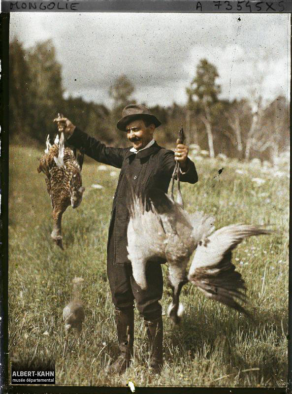 Georges Chevalier (?), Département des Hauts-de-Seine, musée Albert-Kahn, Archives de la Planète, A 72 379 X L'opérateur Stéphane Passet présentant le produit de sa chasse, Entre Kiakhta et Ourga, Transbaïkalie, Mongolie, juillet 1913, (Autochrome, 9 x 12 cm),